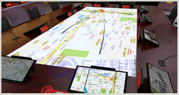 当某地区突发自然灾害、安全事故等突发情况时,指挥中心的指挥人员在接到警情报告时,通过智能交互系统,使用指挥台和移动终端,可一键切换调取相应情况的预案场景,快速进入处突工作模式。此时,所有系统席位、大屏幕、沙盘,将按照预定方案设置切换到相应系统显示界面(如情况通报和情况态势图,其中情况态势图可通过多名值班人员基于一张底图的联合标绘作业生成),还可以通过“音频随路系统”预设到预案场景中,实现音视频信号源一致,避免多路信号同步显示时产生的混音问题。