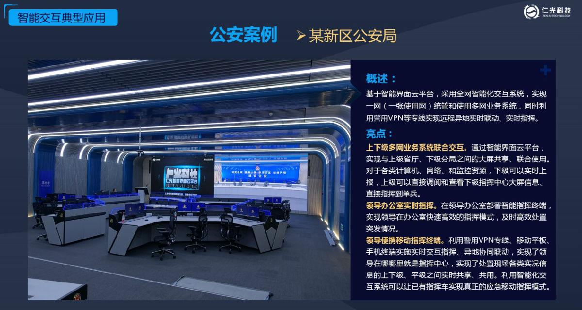 仁光科技以高度信息化条件下联合作战指挥面临的挑战和存在的问题为导向,基于智能交互界面云平台,采用全网智能化交互系统,实现一网(一张使用网)统管和使用多网业务系统,同时利用警用VPN等专线实现远程异地实时联动、实时指挥。在实际应用的需求下,仁光智能交互界面云平台致力于构建警务调度指挥统一操作平台,实现多界面融合、多终端交互、多网系联动显示和可视化操作的建设目标。